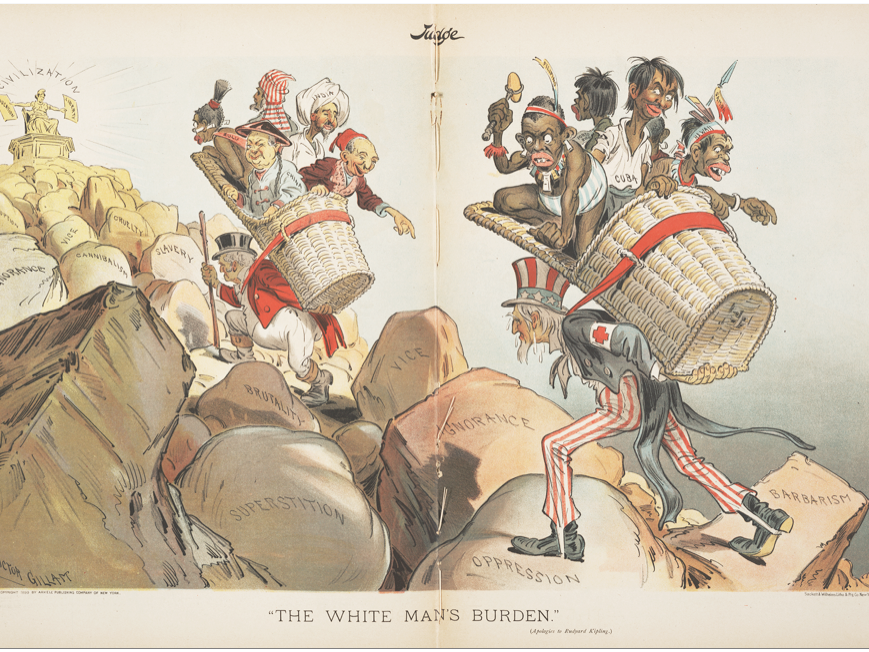 - Daarnaast waren morele motieven van belang. Door het toenemende nationalisme geloofden veel Europeanen dat zij superieur waren vergeleken met gekleurde ‘rassen’. Blanke Europeanen vonden dat ze het recht hadden over de wereld te heersen. Dat recht bracht echter ook een verantwoordelijkheid met zich mee. Europeanen zagen het als hun plicht om achtergestelde en ‘primitieve volkeren’ te bevrijden van bijgeloof, armoede en wrede gebruiken (bron 7). Het was de taak van ‘de blanke man’ om die volkeren te onderwijzen.