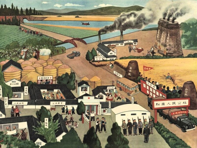 In de praktijk betekende dit dat de land herverdeling deels ongedaan werd gemaakt. Daarvoor in de plaats werden grote gecollectiviseerdeCollectivisatie is het samenvoegen van kleine, privé landbouwbedrijven tot grote staatsboerderijen. landbouwbedrijven gevormd: de volkscommunesEen volkscommune is een grote organisatie op het platteland waarin boeren samenwerkten op staatsboerderijen en geen privébezit hadden.. Miljoenen boeren werden samengebracht in deze landbouwcommunes, waar ze gezamenlijk werkten aan zowel de landbouw als de industriële productie. Een opvallend aspect van dit plan was de nadruk op kleinschalige industriële productie. Boeren werden aangemoedigd om in hun eigen achtertuinen staal te produceren in primitieve hoogovens. Mao was ervan overtuigd dat deze massale inspanning ervoor zou zorgen dat China Groot-Brittannië binnen vijftien jaar op industrieel gebied kon inhalen.