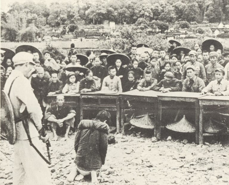 Bron 18. Showproces als onderdeel van de landhervorming door de CCP. Landeigenaren werden vernederd. De CCP ging wel selectief te werk. Zo werden de ouders van Mao, die ook groot landeigenaren waren, gespaard.