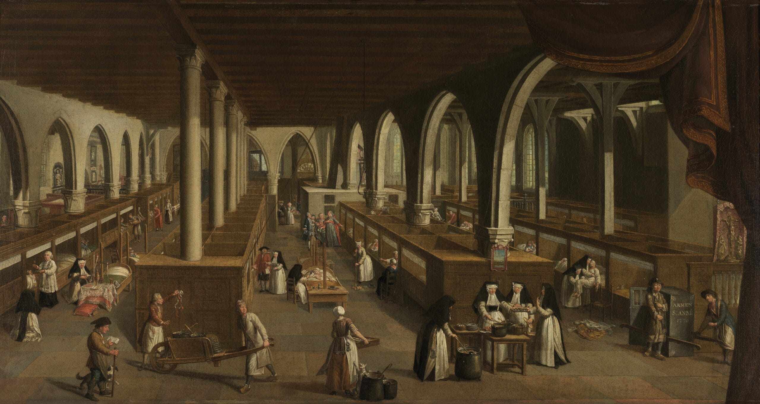 Bron 10. Dit schilderij van Sint-Janshospitaal laat een ziekenzaal zien met meer dan honderd bedden. Het geeft een goede weergave van een middeleeuws ziekenhuis. Wat valt je op aan de mensen die er werken?