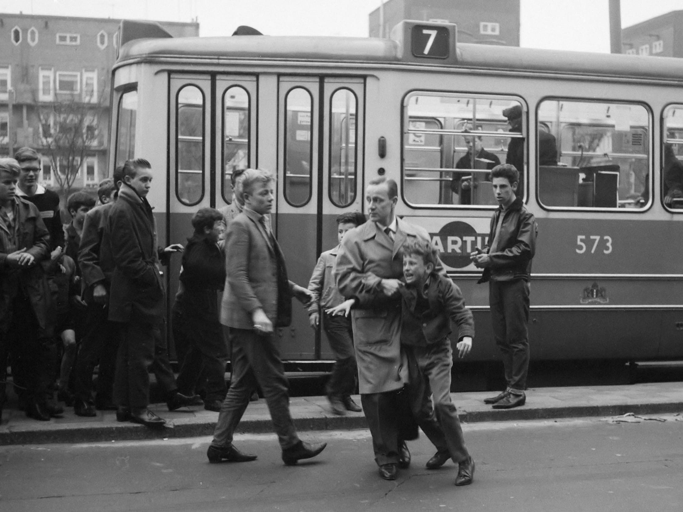 Bron 12. Nozems verstoren twee minuten stilte op 4 mei 1962. De politie grijpt in. Deze jongerenbeweging, geïnspireerd door de kleding, haardracht en muziek van Elvis Presley, keerden zich tegen de oude normen en waarden.