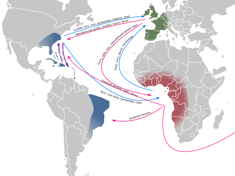 Voor de Europeanen brachten de ontdekkingsreizen enorme economische voordelen. De grote hoeveelheden goud en zilver die uit Amerika werden gehaald, verrijkten de Spaanse kroon en veranderden Spanje in de meest machtige natie van Europa in de 16e eeuw. Andere Europese landen volgden naar Spaans voorbeeld. De nieuwe driehoekshandelHandel tussen Europa, Afrika en Amerika. Hierbij werden producten en slaven tussen deze continenten uitgewisseld. met Amerika zorgde ook voor een enorme toename van rijkdom in andere Europese landen. Zo werd al snel de economische meerwaarde van het plantagesysteem ingezien. Vandaar dat het werd uitgebreid. Maar daar waren extra arbeidskrachten voor nodig. Afrikanen werden als tot slaafgemaakten gekocht op grote slavenmarkten in Afrika, om vervolgens per boot vervoerd te worden naar Midden- en Zuid-Amerika via de trans-Atlantische slavenhandelHet vervoeren van Afrikanen naar Amerika om hen daar als slaven te laten werken.. Daar werden ze geruild voor plantageproducten als suiker, thee, tabak, koffie en indigo; die dan weer per boot naar Europa werden verscheept om daar verkocht te worden. Dit systeem legde de economische basis voor de latere industriële revolutie.