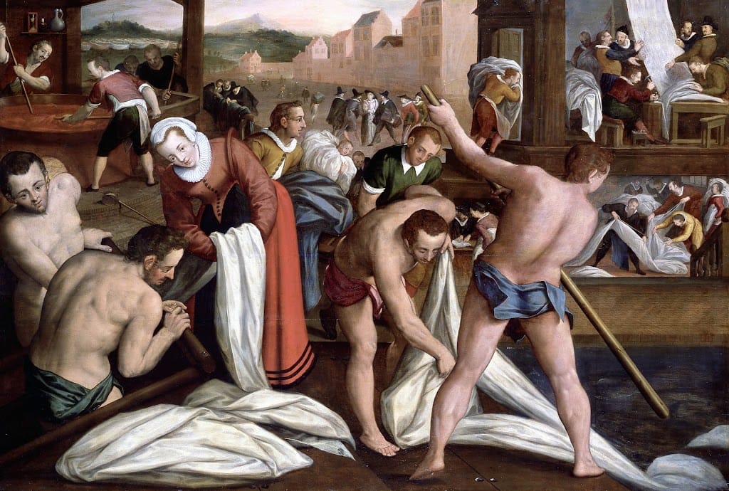 Bron 5. Op dit schilderij van Isaac van Swanenburg zijn mannen en vrouwen bezig met het wassen en bleken van het geproduceerde laken. De Nederlandse stoffen waren van zulke goede kwaliteit, dat ze over de hele wereld verkocht werden.