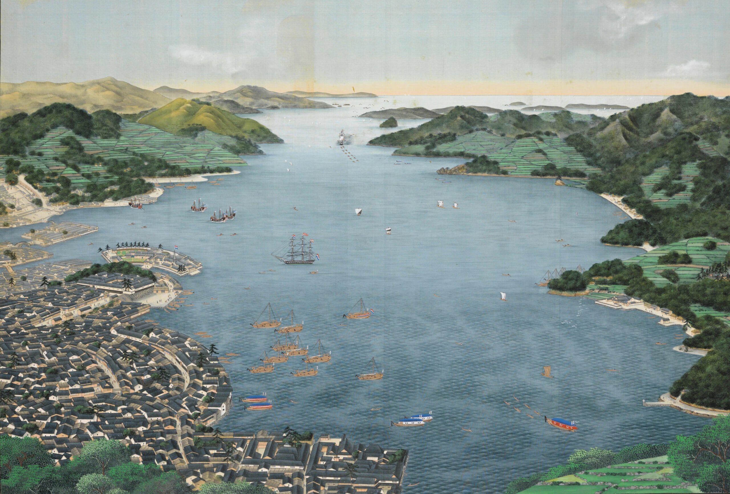 Bron 1. In de periode 1641-1859 waren de Nederlanders de enigen die handel mochten drijven met Japan. Op het kunstmatig aangelegde eilandje Deshima of Dejima stichtte de VOC een handelspost.