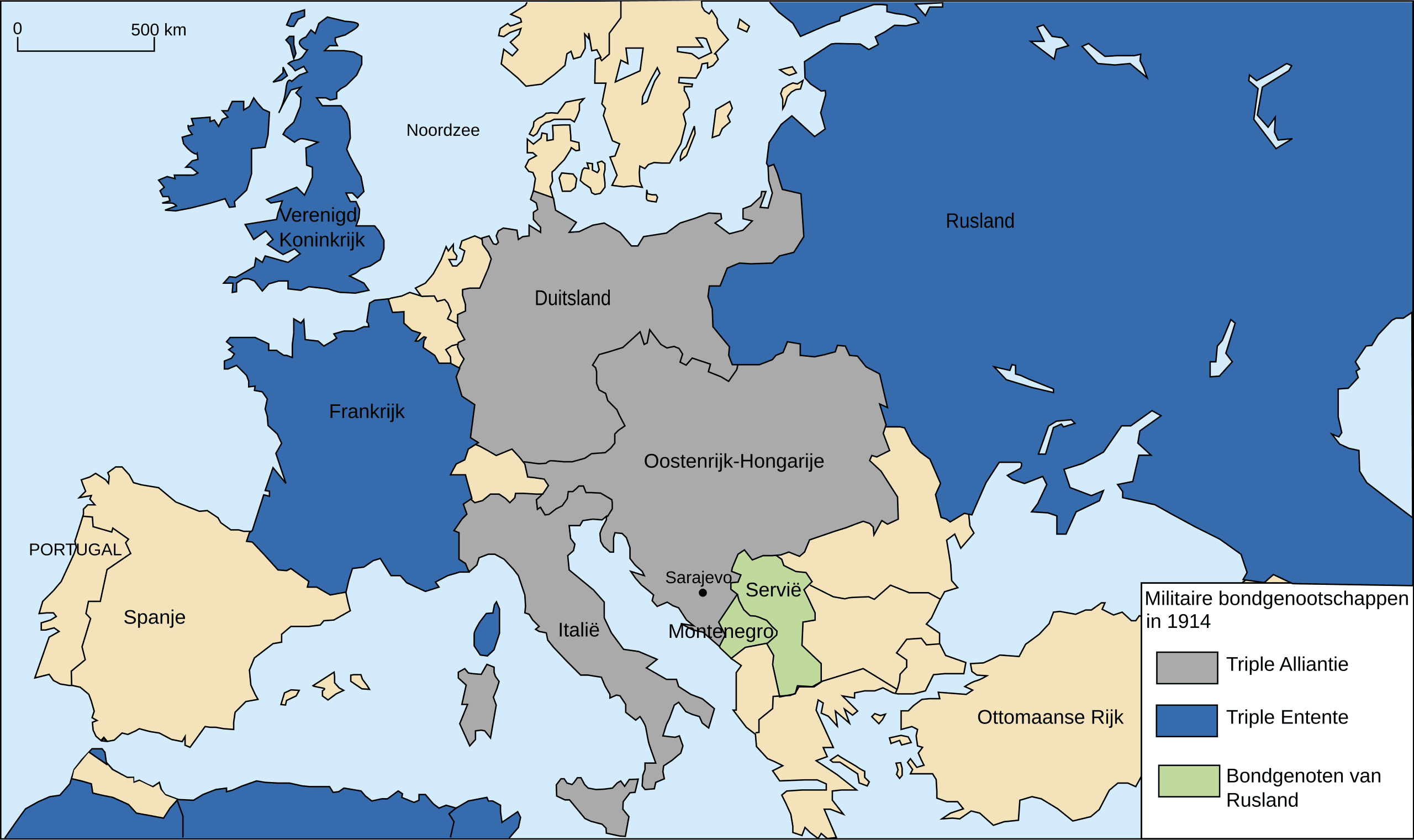 Bron 2. De bondgenootschappen aan het begin van de Eerste Wereldoorlog in 1914.
