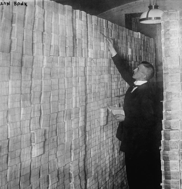 Bron 15. Verschillende economische problemen lagen ten grondslag aan de Duitse ontevredenheid. Hier de hyperinflatie in Duitsland. De stapels met geld waren net genoeg om voor 10 gezinnen ontbijt te kopen.