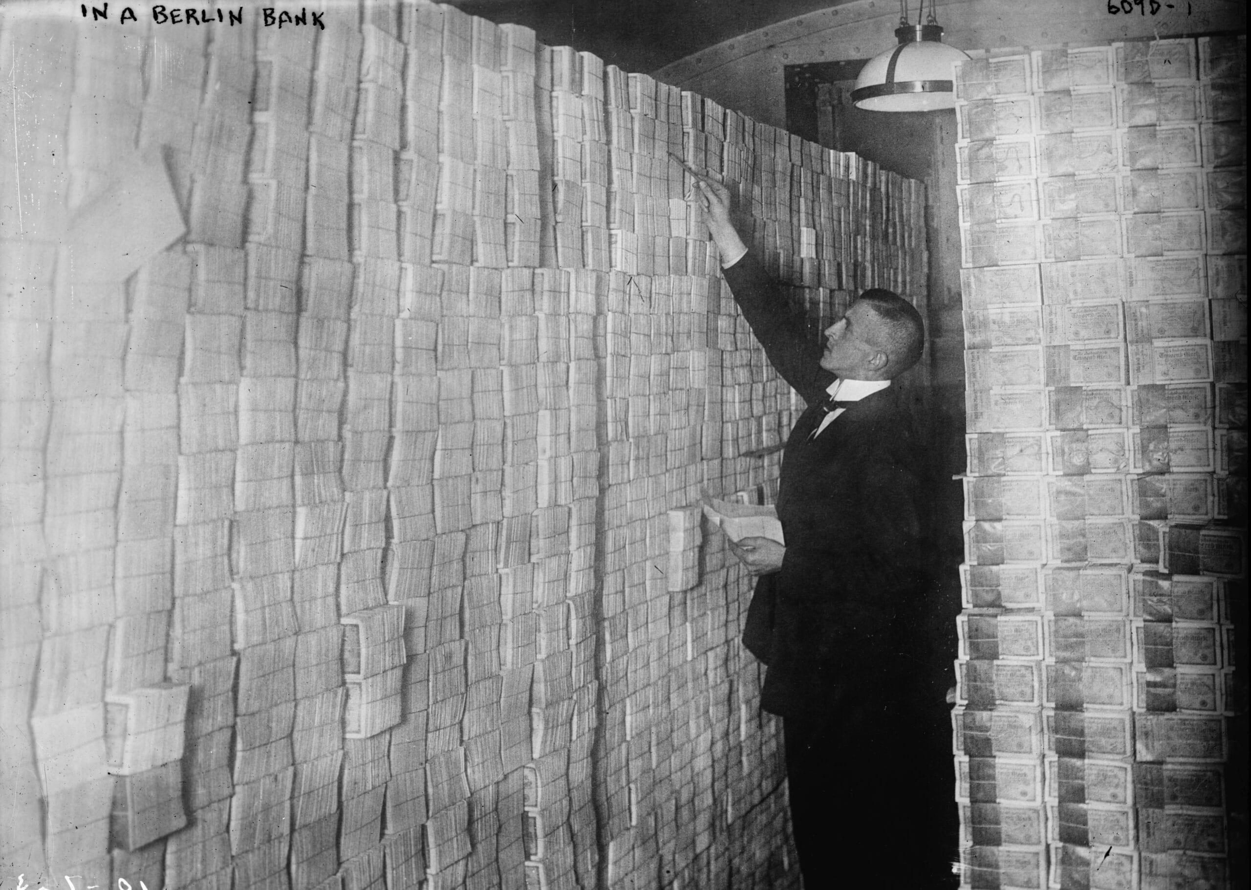 Bron 15. Verschillende economische problemen lagen ten grondslag aan de Duitse ontevredenheid. Hier de hyperinflatie in Duitsland. De stapels met geld waren net genoeg om voor 10 gezinnen ontbijt te kopen.