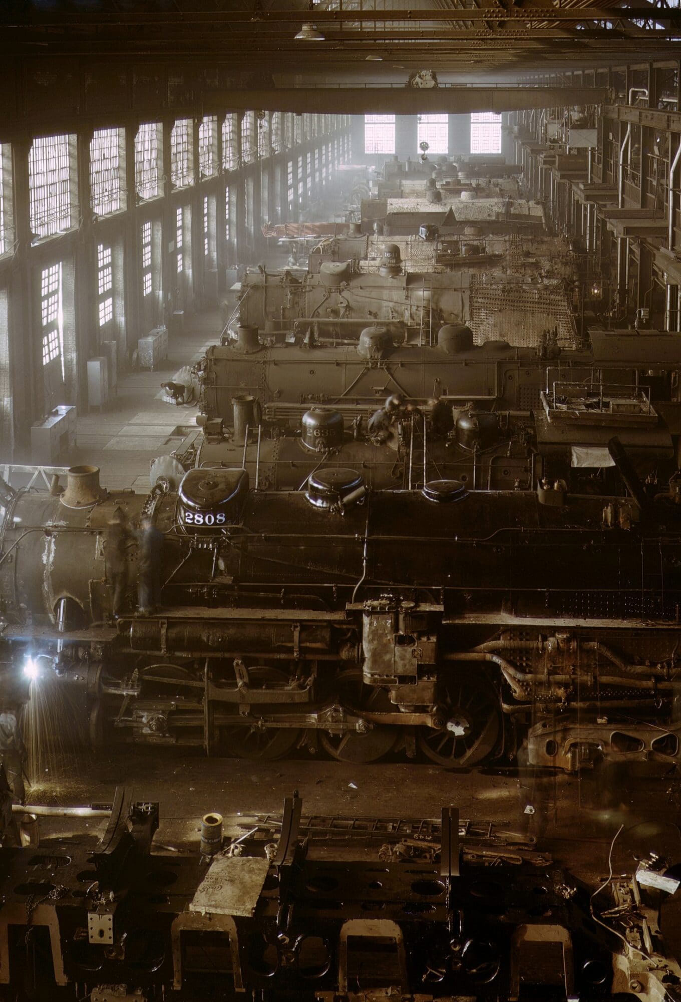 Bron 1. Een werkplaats met daarin stoomlocomotieven, het vervoersmiddel dat symbool stond voor de industriële revolutie.